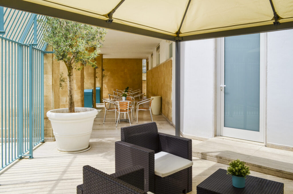 Quando invece il momento lavorativo consente di… respirare, eccoci nella nuova area relax outdoor “Gazebo degli Ulivi”, dove sia la sessione lavorativa sia il colloquio informale, sia – perché no – la pausa all’aperto, viene proposta in ambiente sapientemente arredato con materiali ed elementi di pregio, il tutto sotto una piacevole ombreggiatura.